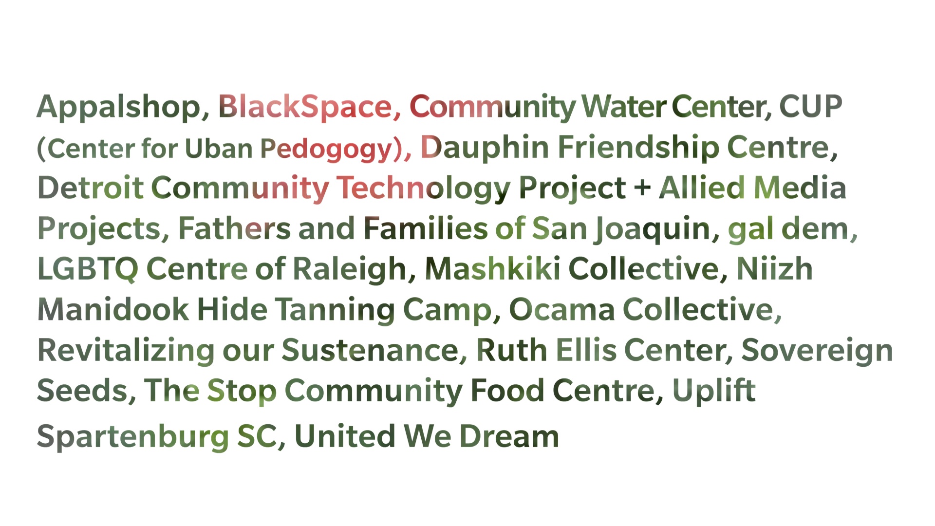 Butterfly: Asian and Migrant Sex Workers Support Network, Detention Watch, Encuentro, Freedom Inc, Maggie’s: Toronto Sex Worker Action Project, Morris Home (Philadelphia), O:se Kenhionhata:tie Land Back Camp (Kitchener, Ontario), Pueblo Action Alliance, Randolph street community garden (Champaign, Illinois), Vipassar, We The People of Detroit
